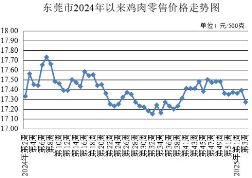 第3周,牛肉农贸市场零售均价为每500克46.80元,较上周下降0.09%。牛腩农贸市场零售均价为每500克43.50元,较上周下降0.21%。鸡肉农贸市场零售均价为每500克17.27元,较上周下降0.69%。