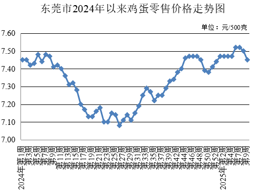 第9周,所监测的鸡蛋农贸市场零售均价为每500克7.45元,较上周下降0.67%。