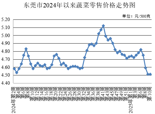 第10周,所监测的30种蔬菜农贸市场零售均价为每500克4.51元,与上周持平。其中,13种叶菜类农贸市场零售均价为每500克4.54元,较上周上升0.67%。17种非叶菜类农贸市场零售均价为每500克4.49元,较上周下降0.44%。
